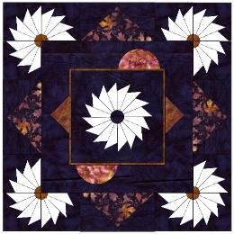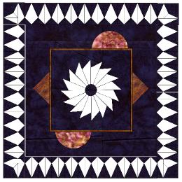 This is also a second choice. I like the use of the focus fabric but I miss the extra triangles of blue that I think give just a little more interest to the piece. | Afte some consideration and looking at the focus fabric I think this is my favorite. The focus fabric is not as busy as it seems in the scan and I like the use of the background to give an on-point feel. |