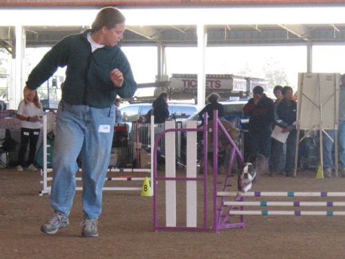 Our first excellent run in jumpers. Dawson knocked the bar on this jump so the rest of the run was for fun. This is the run I remember the most. It was a great course, harder than the open courses and he did really great weaves. Not bad for a dog who has been doing agility for only a year and a half. | ||||