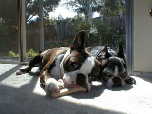 Both of them lying in the sun. Dawson is an energetic chewer so this also didn't last long, he bumped Nutmeg and she moved someplace more restful.