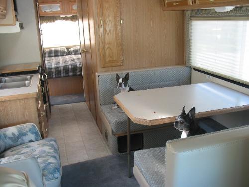 Here is the view of the back of the RV. I am standing by the passenger seat while the dogs are seated very nicely at the dinette. Notice the dog cookies on the table.