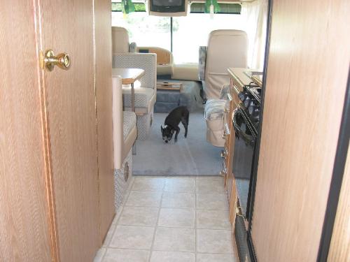 Standing in the bedroom door looking towards the front of the RV. Refrigerator on the right, bathroom on the left. Nutmeg doing crumb patrol.